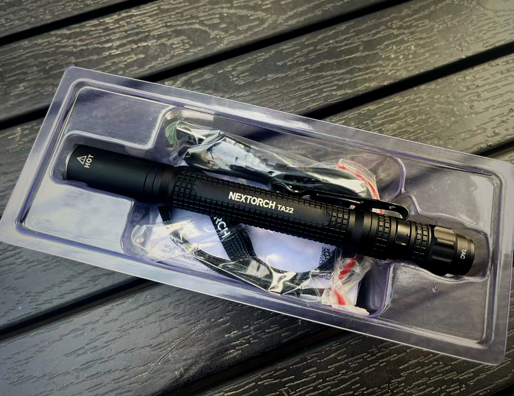 开箱,透明吸塑内衬保护盒中内嵌着纳丽德新春明星:TA22多模式组高亮战术笔电一支。