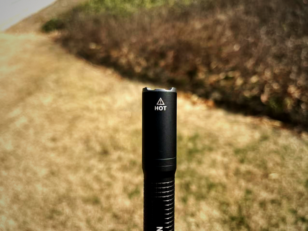 灯头较为光滑,印有“HOT”提醒标识,因为长时间高亮灯头容易产生高温。高亮连开10分钟,实测温度最高大概50-56度左右,冬天用来暖手挺合适的,估计夏天使用时意外触碰可能会有灼热感。