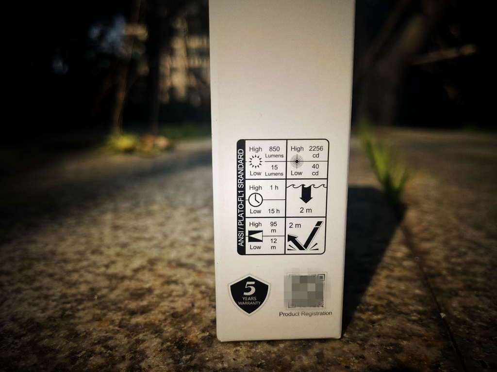 外包装左侧下部,是纳丽德TA22的主要性能图示。包括:光通量15-850LUMENS,发光强度40-2256CD,续航时间1小时-15小时,2米防水,射程12-95米,防2米跌落。质保5年!