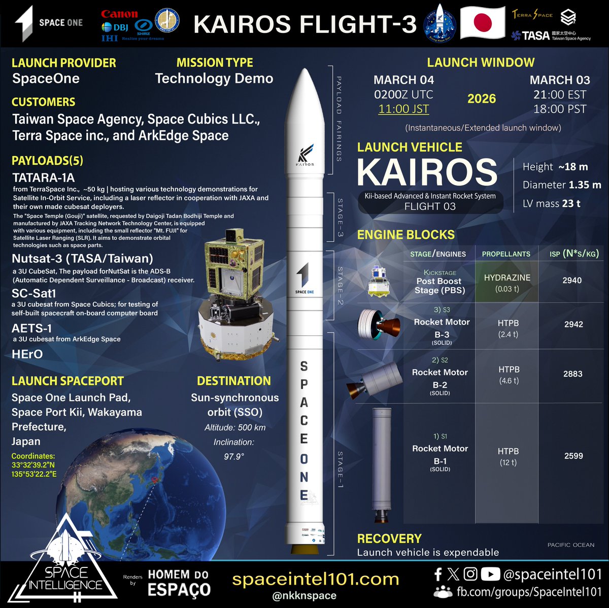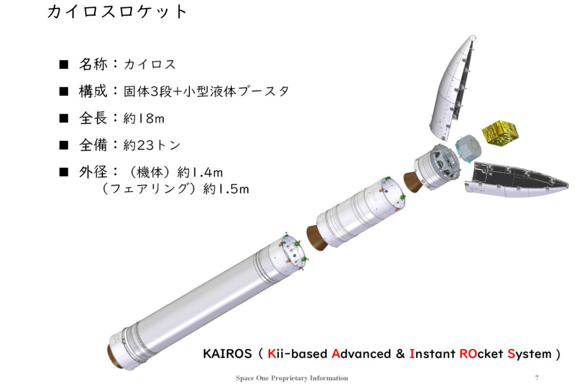 公开资料显示,这家航天公司由日本佳能电子公司、IHI航空航天公司等出资,组建于2018年。其研发的火箭名叫凯洛斯(Kairos),全长约18米、直径约1.35米、起飞重量约23吨,采用四级串联构型:前三级为固体燃料发动机,最后一级为液体燃料发动机用于轨道调整。据官方资料,它的近地轨道运载能力约为250公斤,太阳同步轨道约为150公斤,目标市场是不超过数百公斤的小卫星发射。