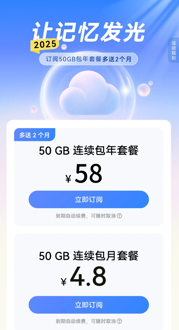 华为云空间对我而言,已经从一个存储工具,变成了我工作流里的关键一环。它不仅解决了存储痛点,更实现了跨设备无缝创作。年末华为云空间还推出了限时福利活动,50GB的连续包年套餐只需58元,还额外再赠送2个月。如果你也需要更省心的存储方案、和多设备间高效协同,不妨入手一年试试——影像珍藏云端,让记忆发光。