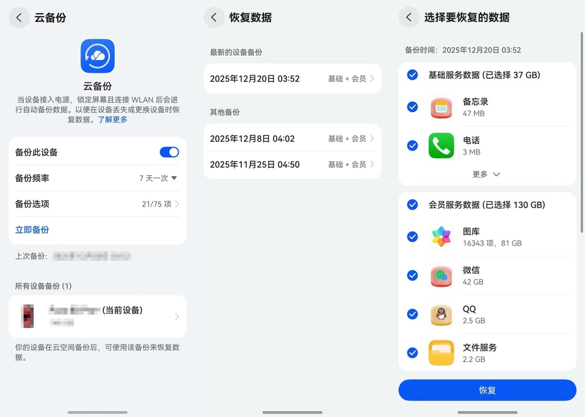 同时,我还开启了“云备份”功能,晚上睡觉前给手机充上电、连好WiFi,锁屏后它就能自动备份。这样一来,就算手机真出了意外,我新换一台设备,只要登录我的华为账号,也能把重要的应用数据和设置找回来。
