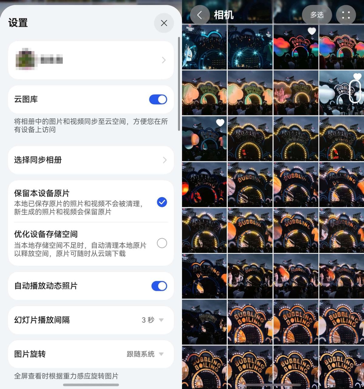 打开“优化设备存储空间”后,系统会根据我的手机存储情况,自动将早期的图片替换为轻量预览图,腾出空间给新的拍摄内容。而所有原始高清文件,都会安全地存放在云端,需要时,立刻下载原图,流畅无感。