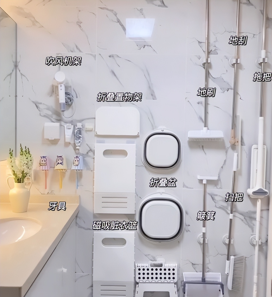 对于墙面收纳,这里并不是说让你放很多的置物架,而是利用墙面空间去收纳清洁物品,
