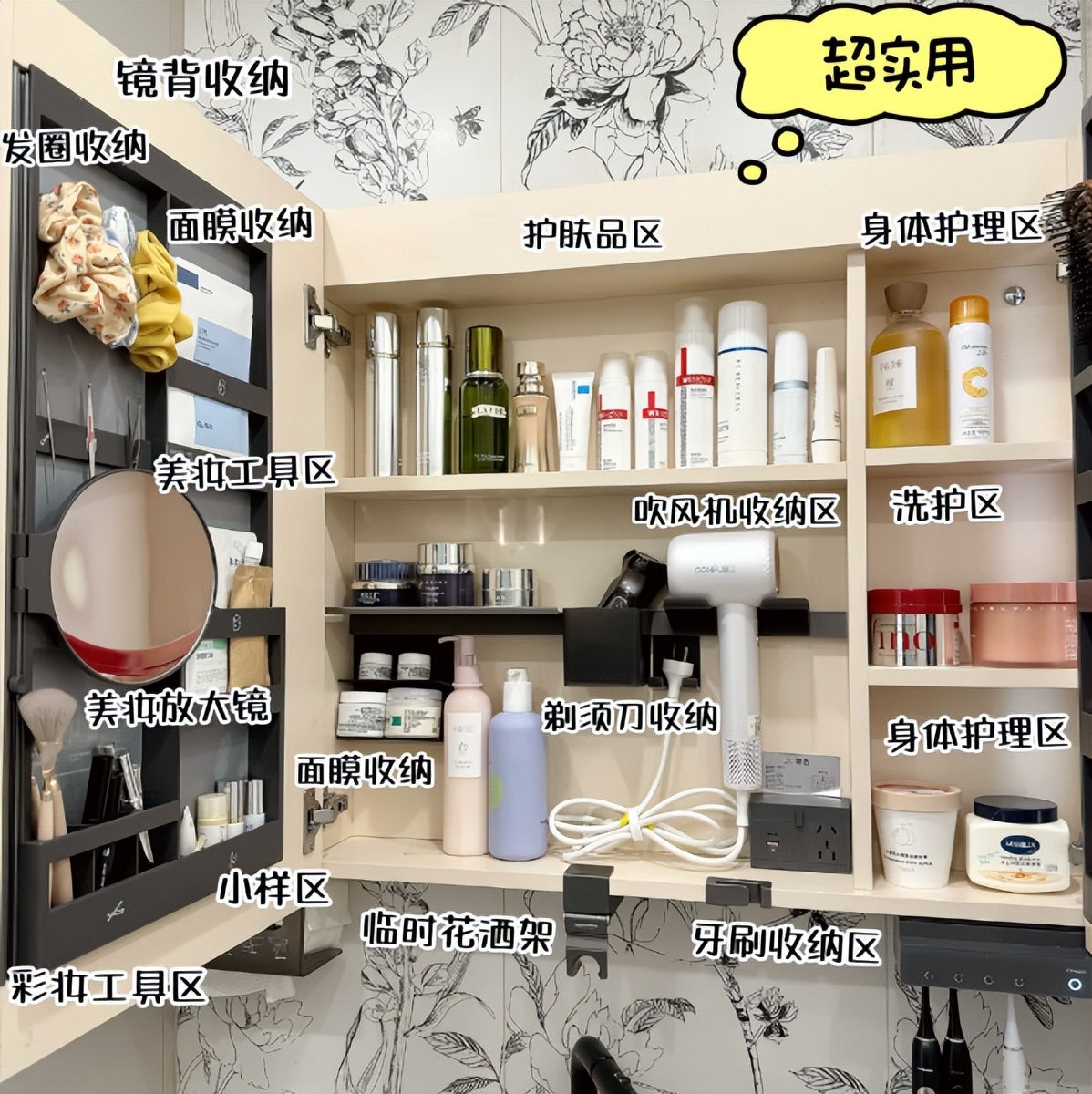 它除了可以放一些常用的洗漱物品之外,还能容纳更多的东西,比如,家里面的面膜、吹风机等等,都能放入到里面,拿取会更方便。