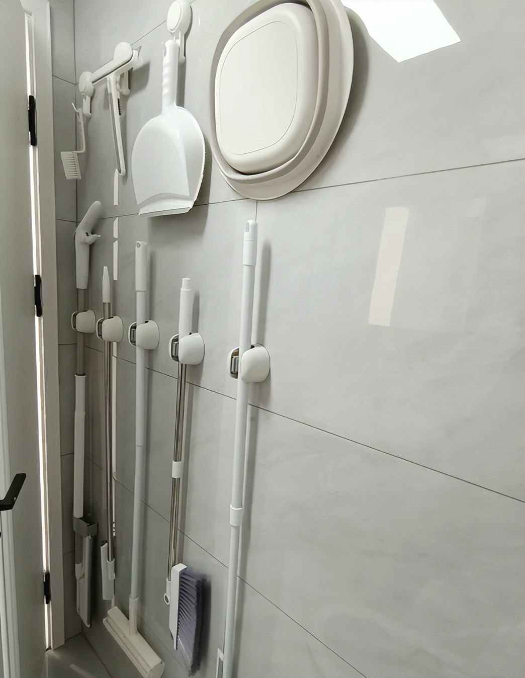 而利用门后墙面的位置,在上面放上一些壁挂收纳架,这样我们经常用的清洁物品,你都能嵌入到上面,整体看着是很干净的。