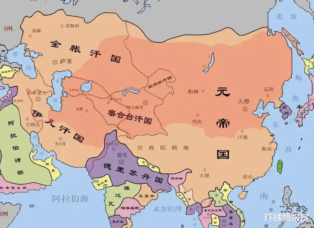 1271年,成吉思汗之孙忽必烈建立元朝,并于1279年彻底消灭南宋,完成中国统一。而此时遍布在中亚和西亚的金帐、伊尔等汗国渐渐走向独立。