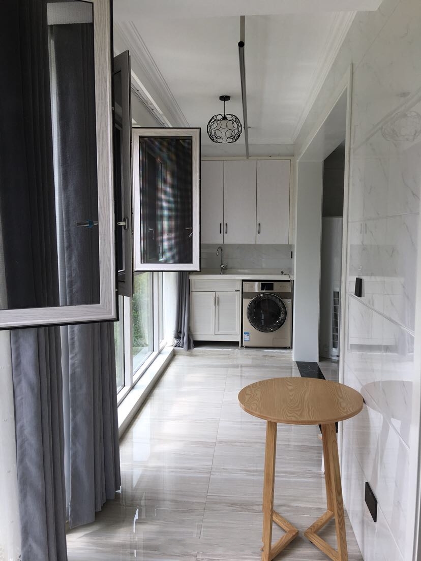 阳台,整个走廊是贯穿的,空间非常大,而且做了封包的设计,作为晾晒区就很宽敞了,而且一端做了定制的洗衣台以及吊柜,阳台的采光非常好,虽然做了封包,但是采光和通风性能都很好,特别是这边是向阳的,所以作为衣服的晾晒区就很实用了。