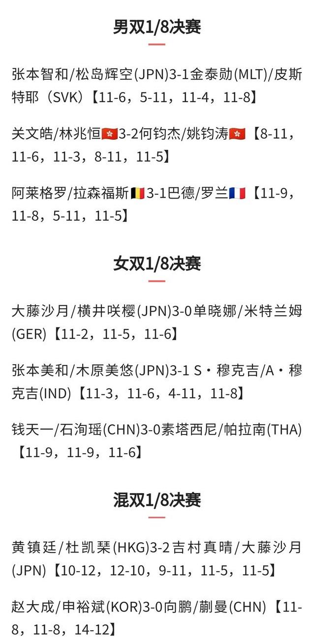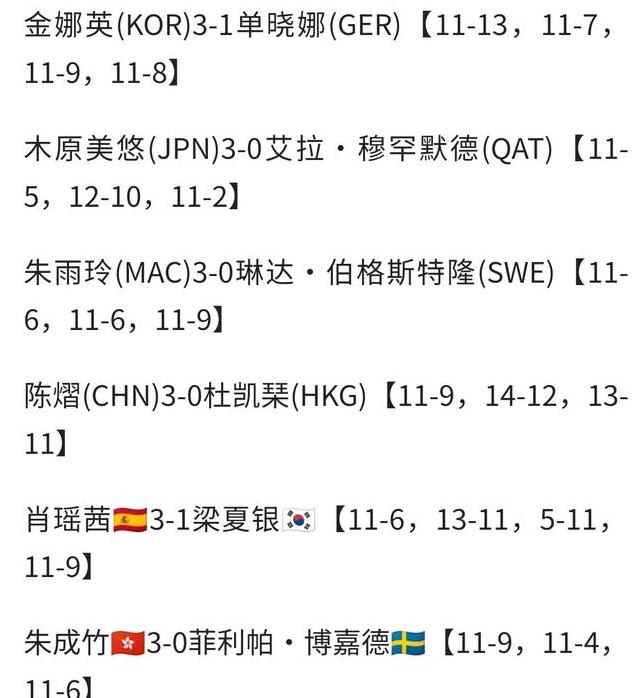 日乒名将木原美悠同样直落三局3-0横扫东道主选手。韩国选手金娜英3-1逆转德国选手单晓娜,肖瑶茜3-1韩国选手梁银夏,具体比分如下: