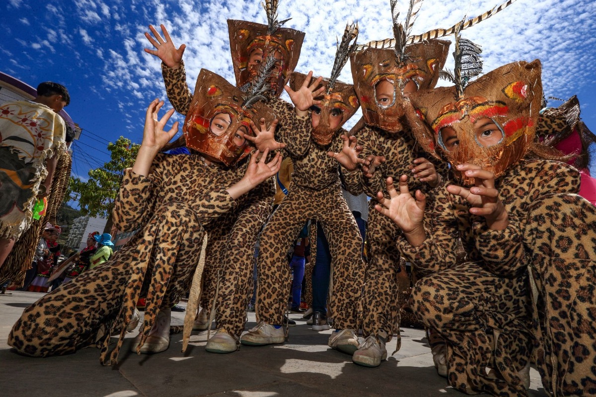 老虎笙是彝族虎信仰的活态传承,舞者身披黑毡为虎皮,赤膊绘斑纹,腾跃间似山君巡疆,充满野性张力的舞蹈既是祭祀天地的重要仪式,也承载着祈求丰收的质朴愿望,它还是双柏县的三项国家级非物质文化遗产之一。大锣笙以锣为语,踏地成节,男性舞者头戴木质或纸糊面具,身着草衣赤足起舞,在锣声变幻中完成人与天地的沟通。小豹子笙则洋溢着山野童真,少年们身绘豹纹,在锣鼓声中模仿幼豹嬉戏,从屋顶跃到院落,由逐户巡游至群聚共舞。灵动轻快的仪式既是对豹灵庇佑的感恩与礼赞,亦寄托着对人畜安康、村寨祥和的美好祈愿。