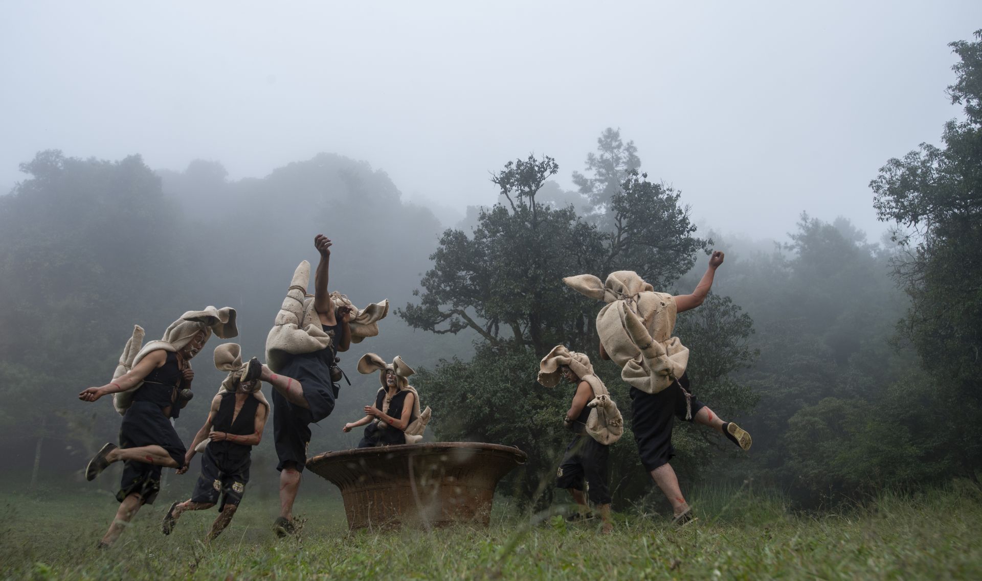 希林娜依·高循声而去,看见一群男孩正站在古树下,黝黑的皮肤绘有黄色斑点,他们幻化为一只只矫健的小豹子,跑着、跳着,带着纯真与山灵的野趣。紧接着,锣鼓声响起,男孩们随之起舞,并变换起不同舞步,人与自然在此刻交融——这正是“三笙”仪轨之中最具野趣与童真的一支:小豹子笙。