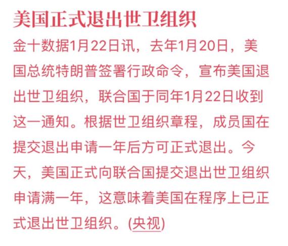 根据世卫组织章程,成员国必须提交退出申请并等待一年,才可以正式退出。2025年1月22日,美国正式向联合国提交了退出世卫组织的申请,并在这一过程中,与世卫的关系进一步恶化。特朗普政府决定退出世卫,主要基于其对世卫组织在新冠疫情应对中的批评,指责世卫组织未能有效制止疫情蔓延,尤其是其对中国的处理方式。然而,这一决定在全球范围内引发了强烈的反应