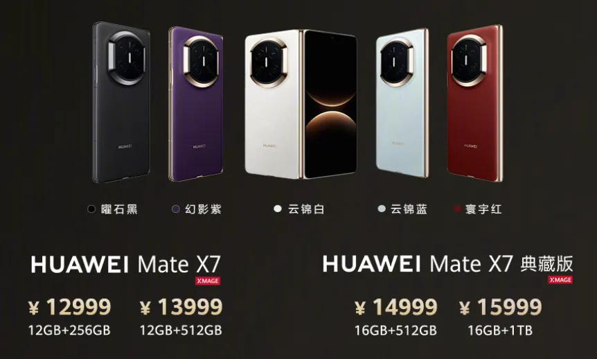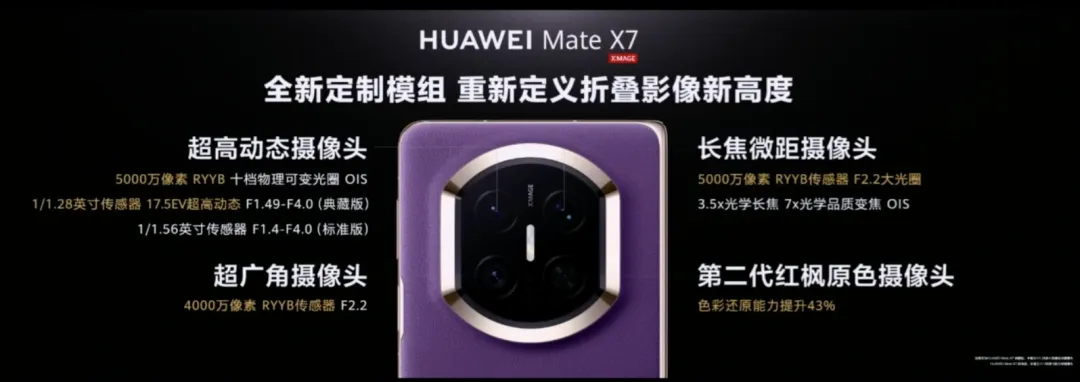 华为Mate X7系列配备5000万像素RYYB十档物理可变光圈主摄、4000万像素RYYB超广角(光圈是F2.2)、5000万像素RYYB长焦微距以及第二代红枫原色摄像头。