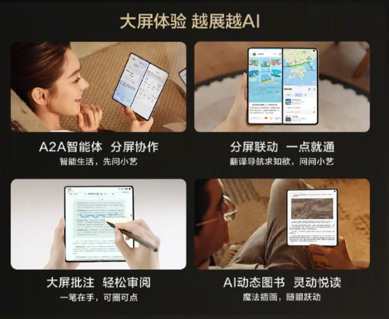 HarmonyOS 6也针对大屏做了针对性的优化,支持A2A智能体分屏协作、大屏批注、AI动态图书、分屏联动。