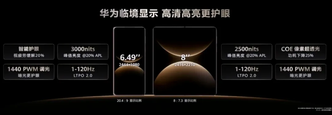 6.49英寸OLED外屏,分辨率为2444 x 1080,峰值亮度3000nits;内屏尺寸为8英寸,分辨率为2416 x 2210,峰值亮度2500nits。