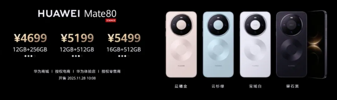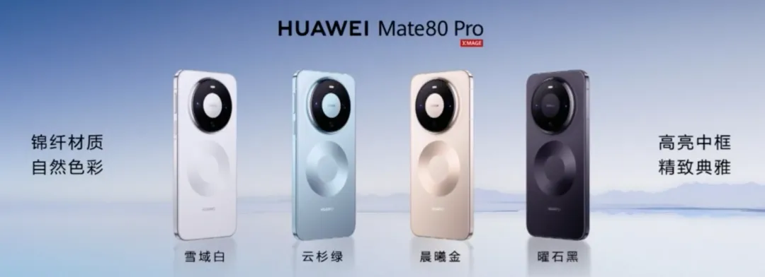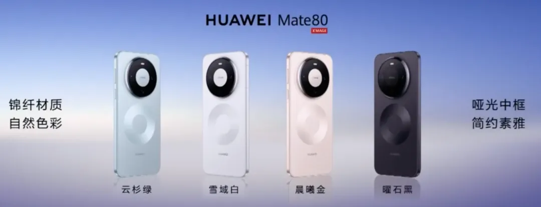 Mate 80拥有曜石黑、雪域白、晨曦金、云杉绿四种配色,中框为哑光材质。