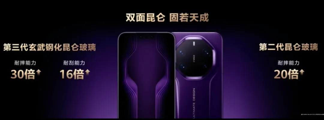 正面为第三代玄武钢化昆仑玻璃耐摔能力提升30倍,耐刮能力提升16倍,背面是第二代昆仑玻璃耐摔能力提升20倍,中框采用了高亮钛玄武机身。