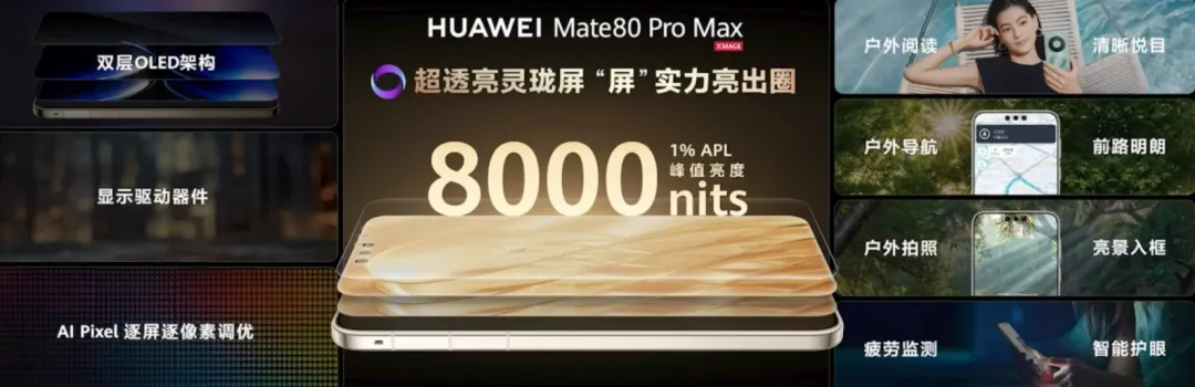 正面是一块双层OLED架构的超透亮灵珑屏,1% APL峰值亮度可以来到8000nits(这个是真的闪)。