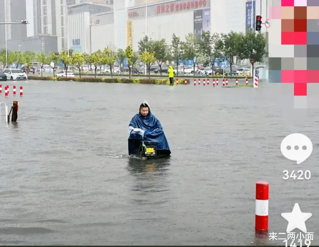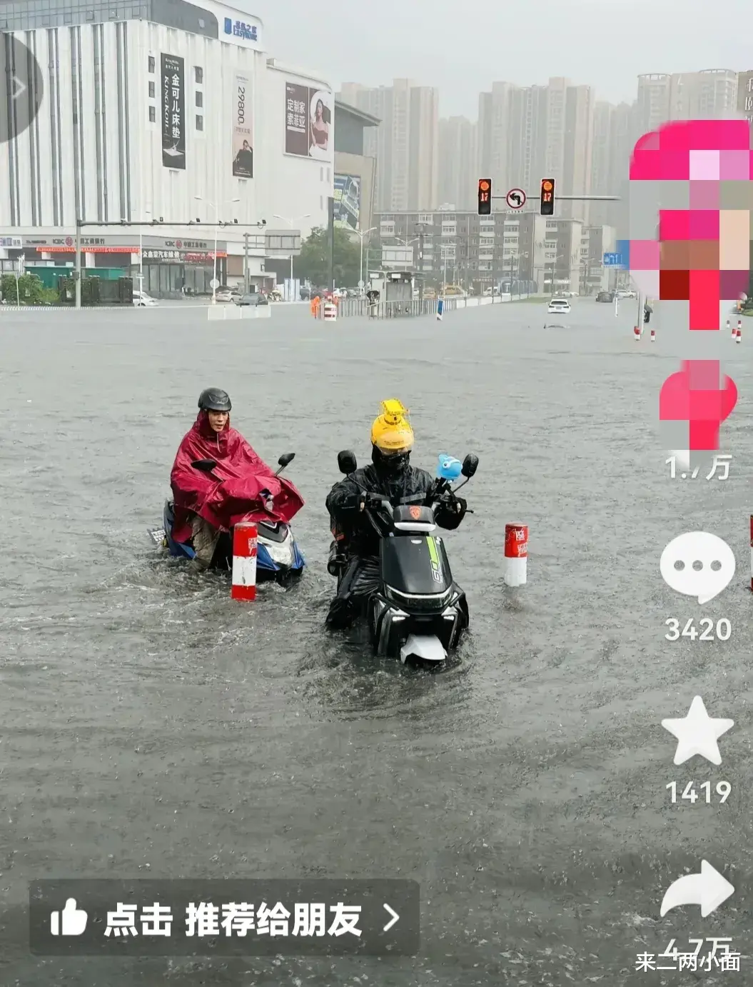 骑电瓶车的小哥哥还是小姐姐,什么牌子的车性能这么好,还可以当“潜艇”开,水都把车淹完了,一定要注意安全哦。