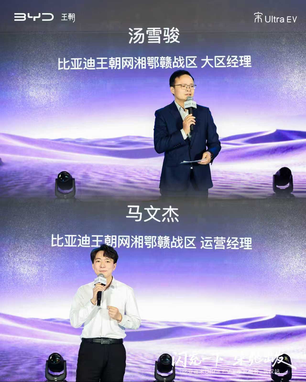发布会现场,比亚迪王朝网湘鄂赣战区大区经理汤雪骏登台致辞。他表示,比亚迪王朝网自诞生以来,始终坚守“技术为王、创新为本”的理念,持续彰显民族自信、科技自信、品牌自信。宋家族作为王朝网核心力量,深受市场与用户认可。此次宋Ultra EV登陆武汉,不仅是宋家族的全新升级,更是比亚迪以技术普惠用户、推动纯电出行普及的重要举措。随后,比亚迪王朝网湘鄂赣战区运营经理马文杰对宋Ultra EV进行了全面解读,从闪充技术、安全性能到驾乘感受,全方位展现新车的越级实力。