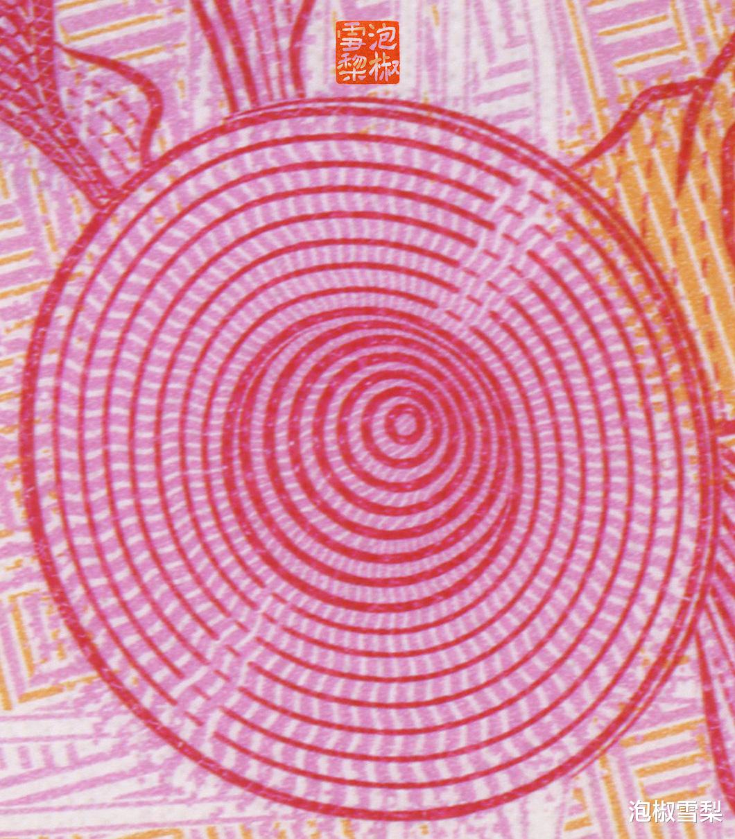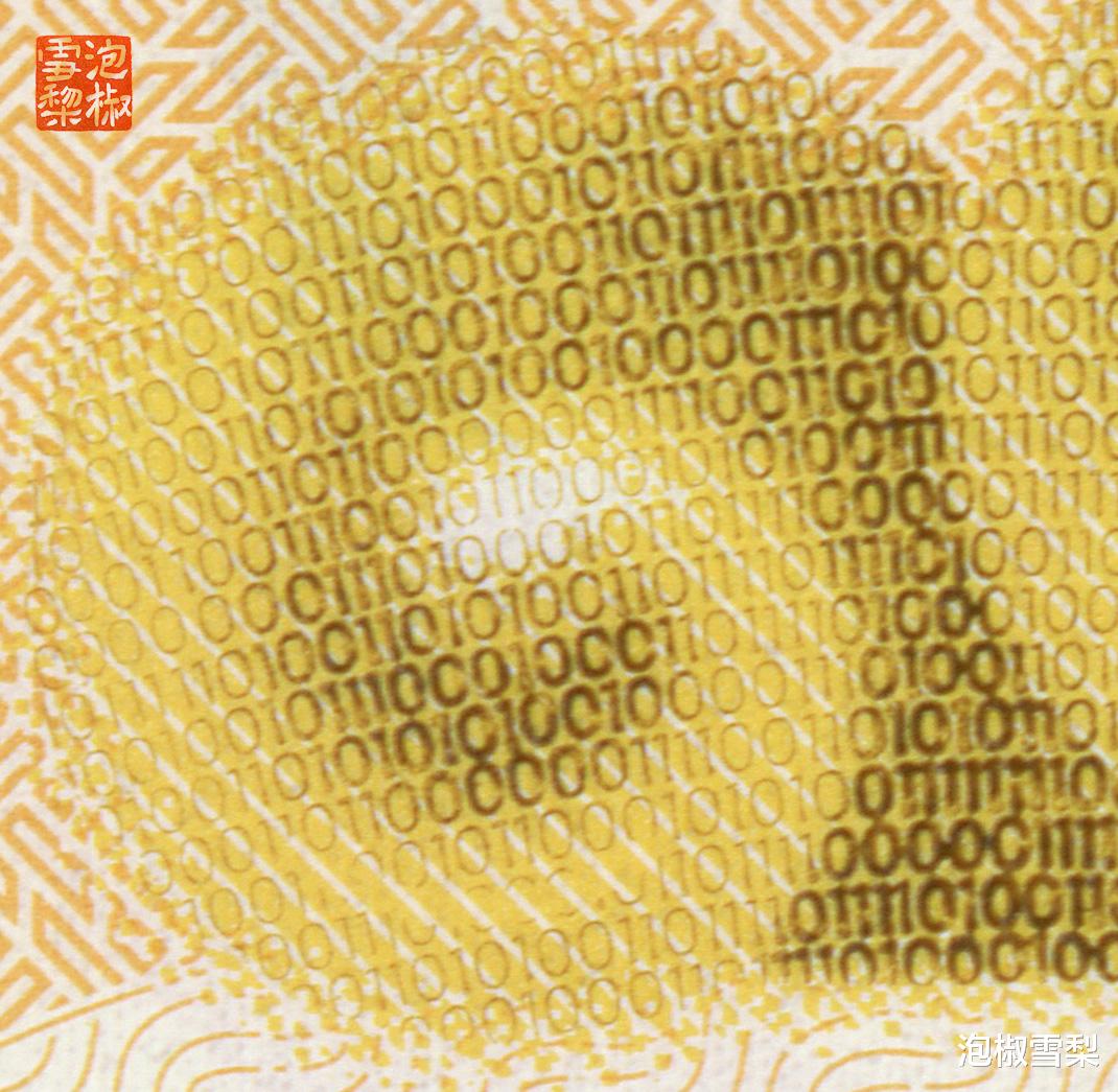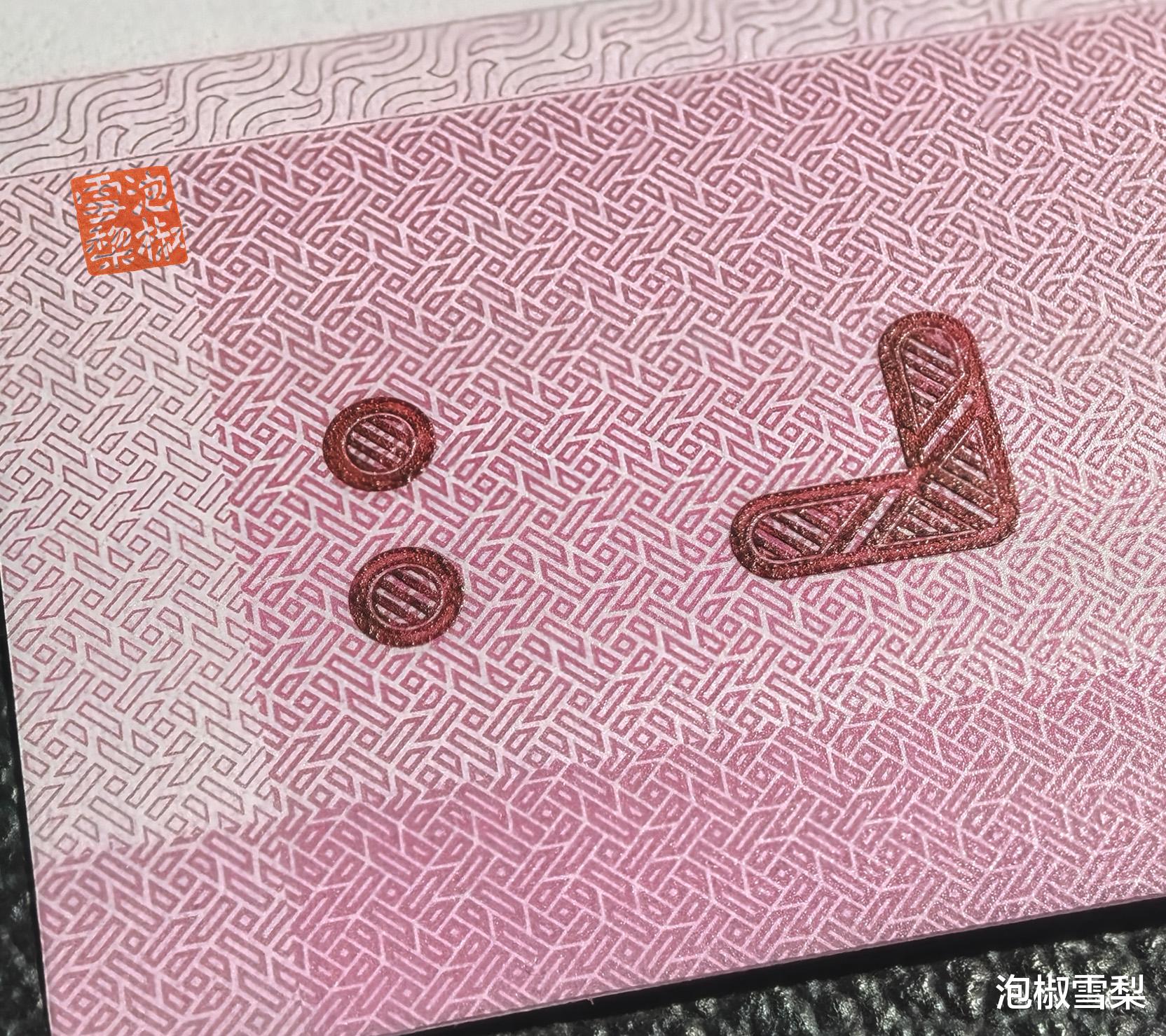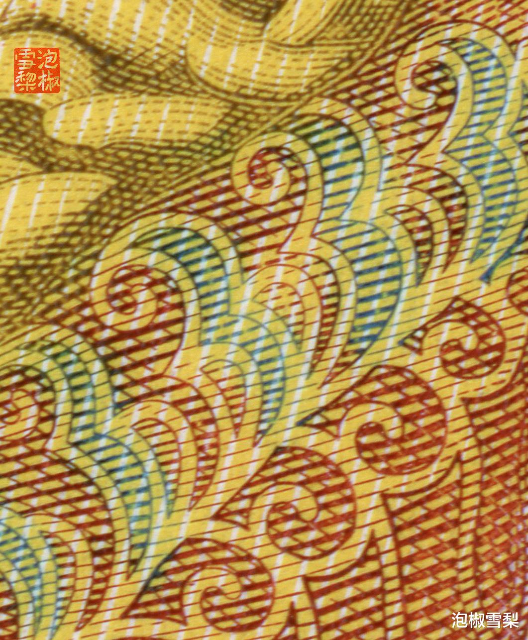 钞票采用雕刻版印刷,纹路幅度不是很大,但非常细腻,手感上没有流通纸币明显,较大面积的雕刻油墨上也没有了以往的线条,触感上接近磨砂效果。