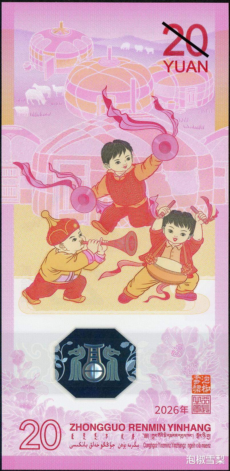 2026年1月20日,中国人民银行发行贺岁纪念钞1张,面额20元,票面长145毫米,宽70毫米,采用塑料材质,发行数量为1亿张,其中历史货币档案留存2万张。