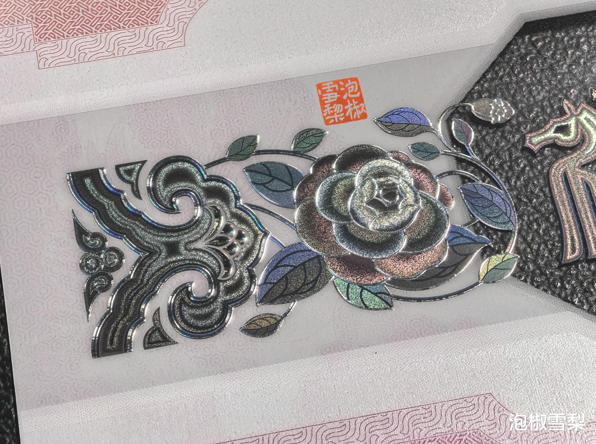 全息部分有银白色金属光泽,变换角度时花瓣处会有散发光芒的效果。