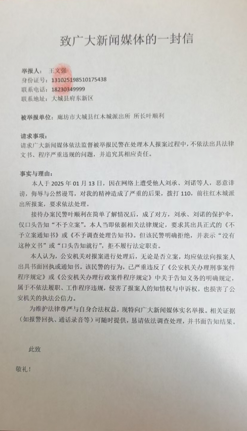 2025年1月13日,对于王文强来说,本是寻求正义的开始,却成了维权困境的起点。当日,他因遭受网络恶意诽谤、侮辱及谩骂,精神受到严重损害,前往廊坊市大城县红木城派出所报案,希望警方能依法处理侵权者刘承、刘诺等人。然而,接待他的派出所民警叶顺利,在简单了解情况后,仅口头告知“不予立案”,便将他的诉求挡在了法律程序之外。
