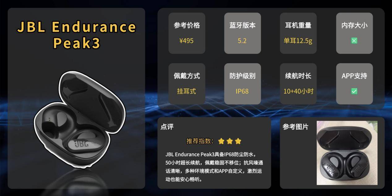 JBL在大众运动耳机市场属于成熟品牌,长期强调户外稳定性与动感调音。Endurance系列主打极限环境与高强度训练,Peak3在其中属于高防护+长续航的越野性能款。