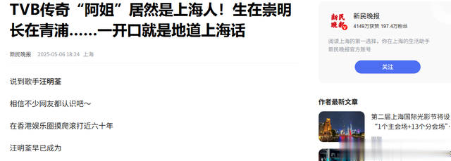 信息来源:新民晚报——TVB传奇“阿姐”居然是上海人!生在崇明长在青浦……一开口就是地道上海话