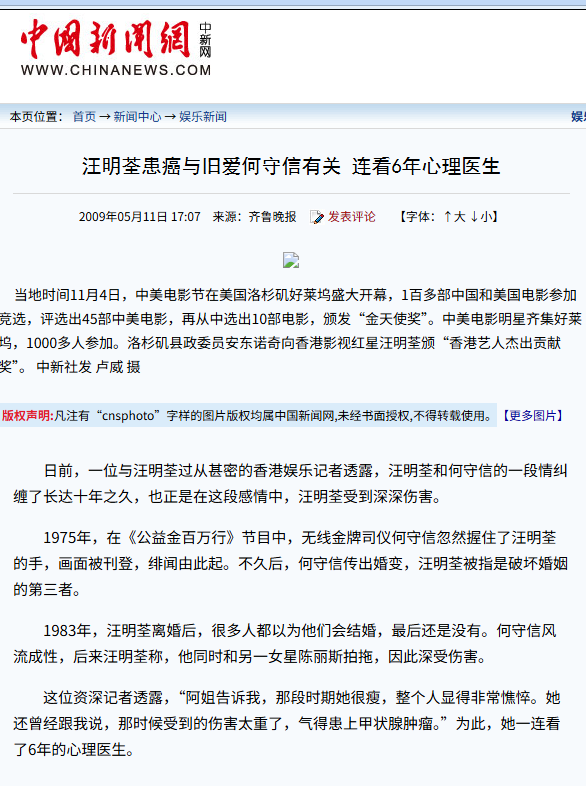 信息来源:中国新闻网——汪明荃患癌与旧爱何守信有关 连看6年心理医生
