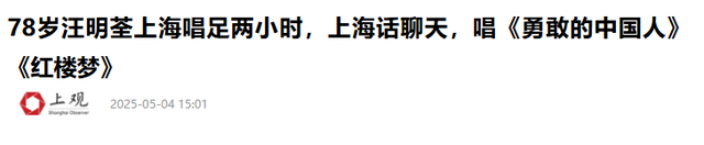 信息来源:上观新闻——78岁汪明荃上海唱足两小时,上海话聊天,唱《勇敢的中国人》《红楼梦》