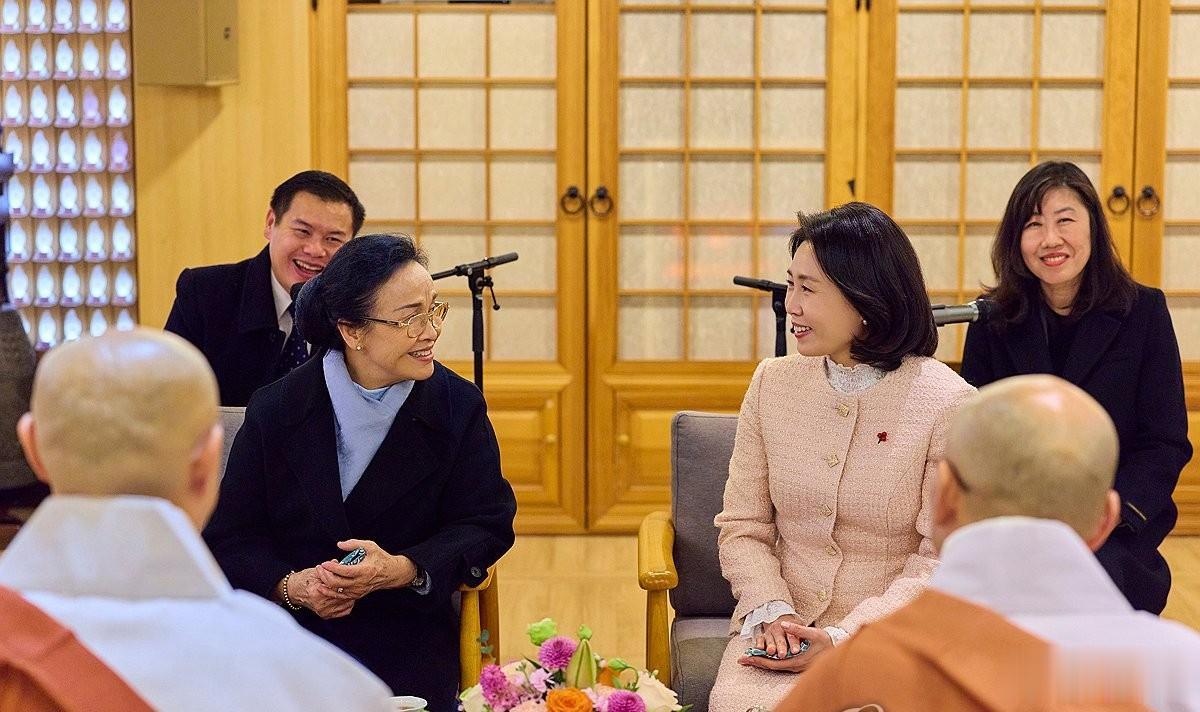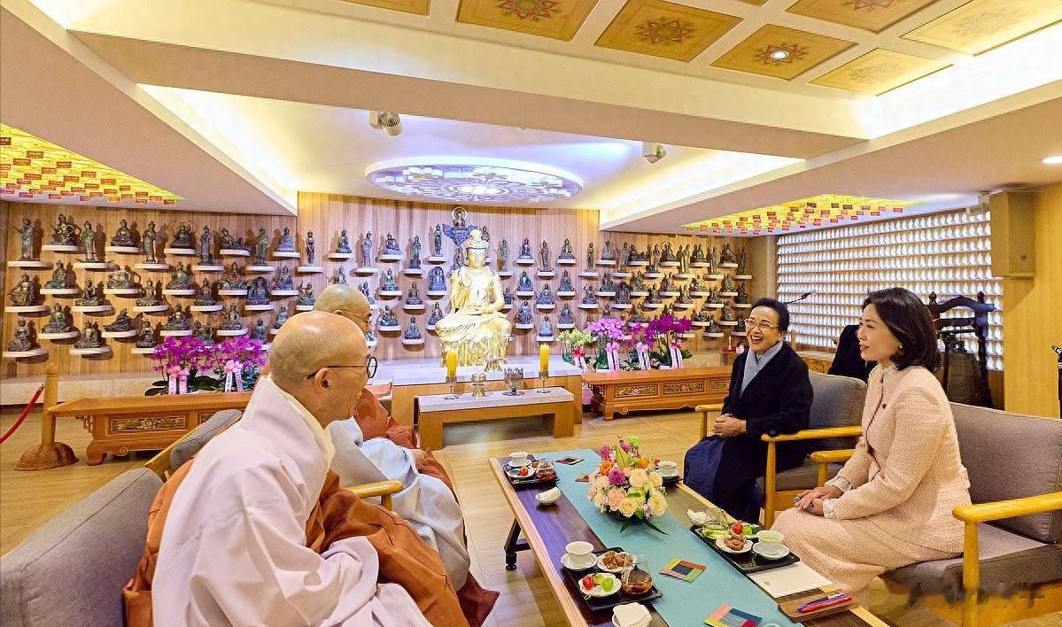老挝主席夫妇14日就已经抵达了首尔,当天,金惠京陪同老挝第一夫人参观了鸡鸣寺。金惠京穿着一身皮粉色小香风套装裙,披肩发,知性优雅。