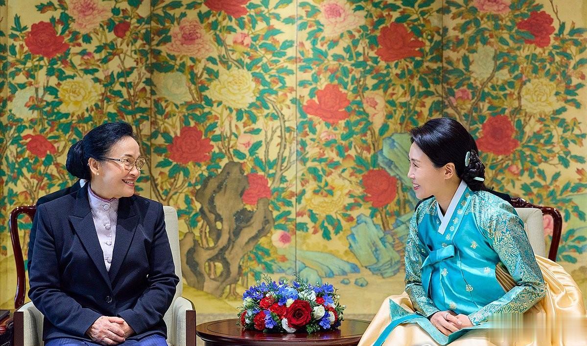 老挝第一夫人同样一身老挝传统服饰,藏蓝色衣裙,搭配黑色小西装,传统服饰和现代知性外套不显突兀,依旧很优雅知性。两位夫人坐在一起聊天,虽然需要通过翻译解说,但是也不影响两人相谈甚欢,老挝第一夫人不时侧身向金惠京,两人相视而笑很是愉快。