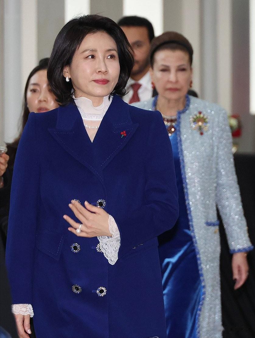 金惠京如今已经58岁了,作为第一夫人,她和金建希一样都偏爱职业套装裙的穿搭风格,这样的着装符合年龄,大概也更凸显第一夫人的端庄优雅吧。