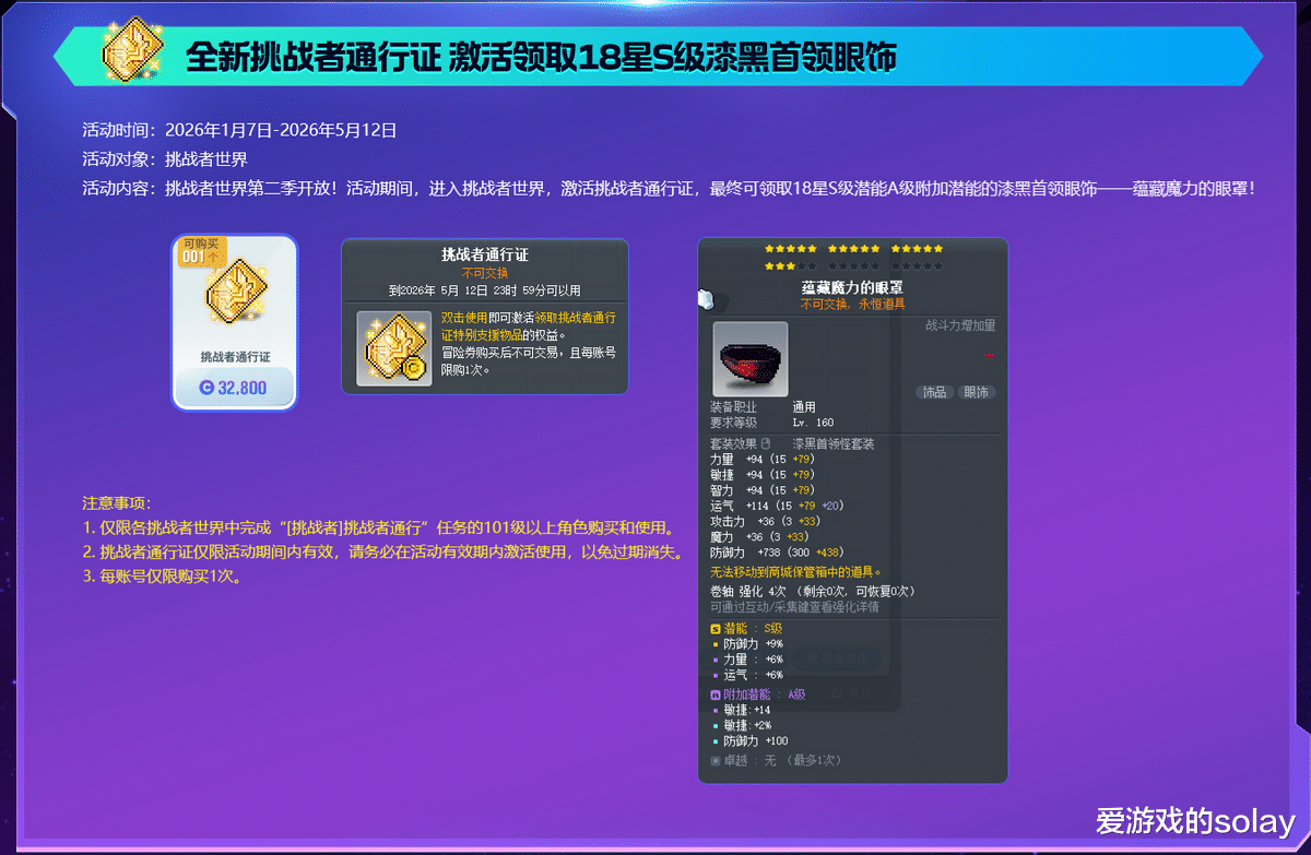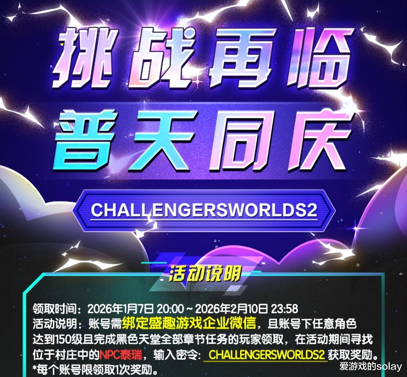 除了新职业的惊艳亮相,官方还同步甩出超多重磅活动,玩法够丰富,奖励够硬核!高燃赛季服 “挑战者世界第二季” 霸气回归,激活就能直接抱走18星S级漆黑首领眼饰,战力起步即巅峰~