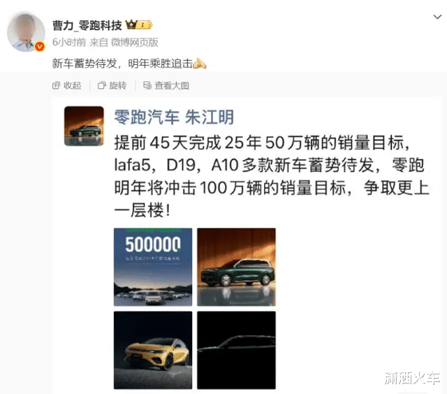 想要达到这个销量,除了在售的车型保持超高的性价比以外,还要有更多的车型要与我们见面,而零跑创始人、董事长兼CEO朱江明于朋友圈所发表的言论。接下来还有D19、D99以及零跑A10将于我们见面。