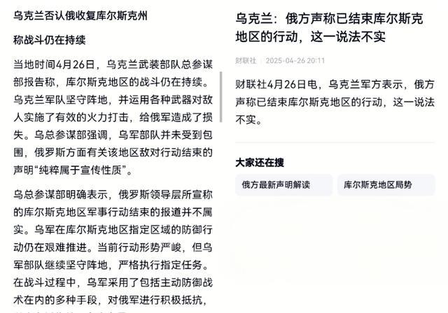 与此同时,据财联社等媒体报道,当天,乌军方迅速回应——否认俄收复库尔斯克州,称战斗仍在持续,尽管当前行动形势严峻,但乌军部队继续坚守阵地,严格执行指定任务,俄方有关库尔斯克战役已结束的声明“纯粹属于宣传性质”