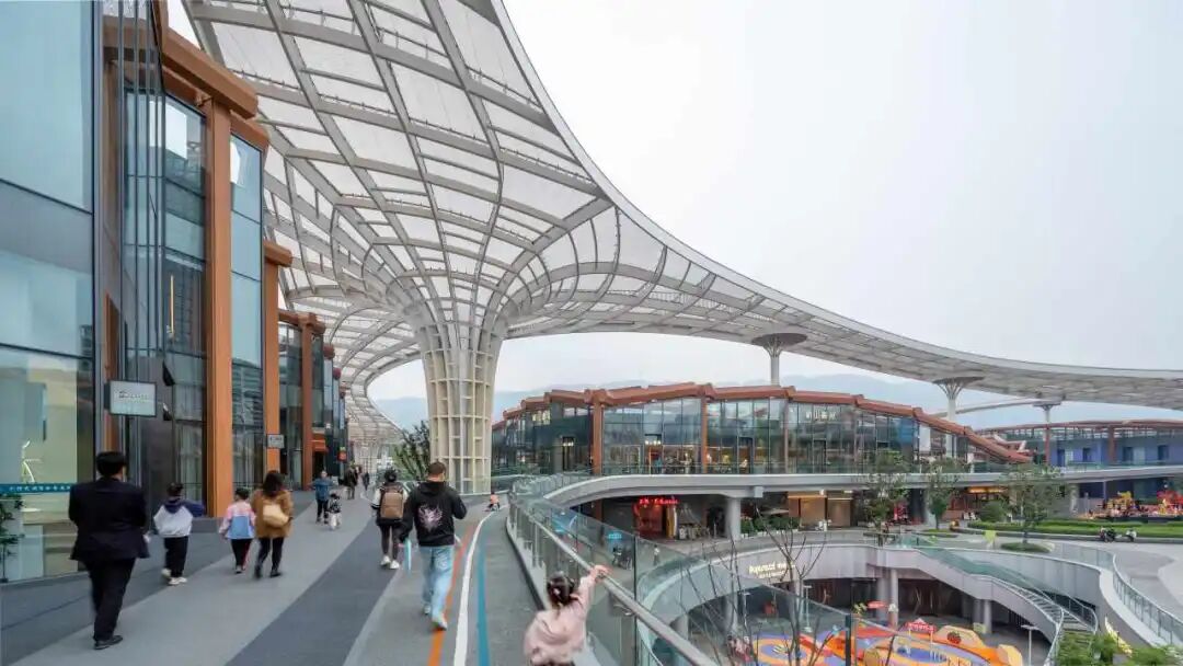 在可持续层面,项目广泛运用整合新风与遮阳的幕墙系统、全域生态屋面,并在站前商业建筑中创新引入四川首例重组竹平面桁架结构,结合光伏屋顶,探索绿色技术与地域材料的对话。