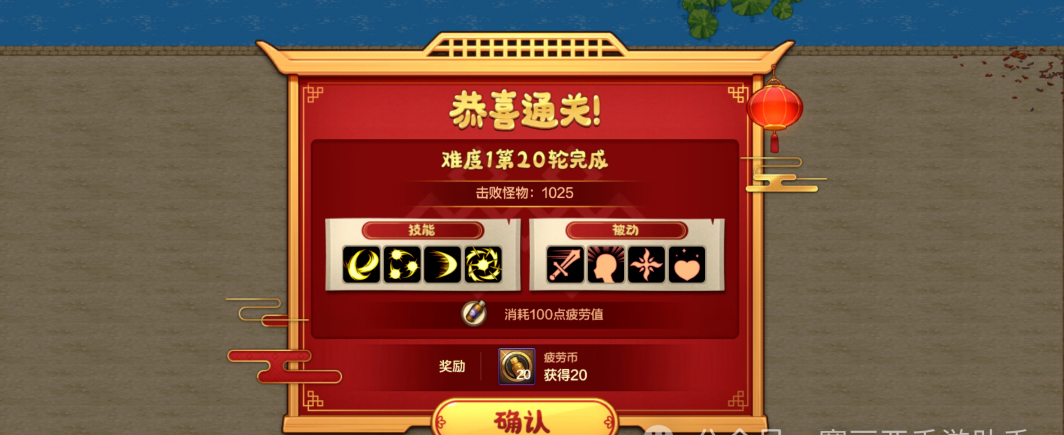 2. 进入游戏后,有 20 轮小游戏。每轮可以选道具,随便选就行,都能用得上。然后就可以挂机啦,技能自动,除了第 20 波领主 boss 可能要动一下,前面都不用管。挂完机总共能得 20 个疲劳商店的货币。