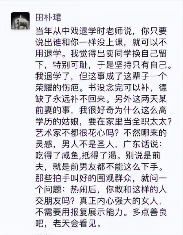 出生普通,考入中戏,中途被开除1981年,田朴珺出生于上海,家庭普通。但在家庭里,成员众多,父亲有严重的重男轻女倾向,田朴珺在家里并不受欢迎,也没有感受到多少家庭的温暖。