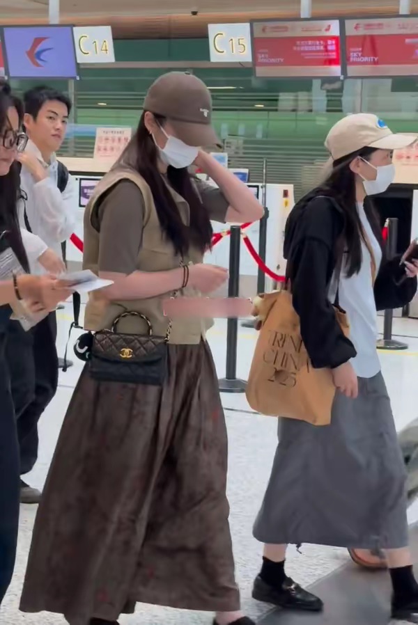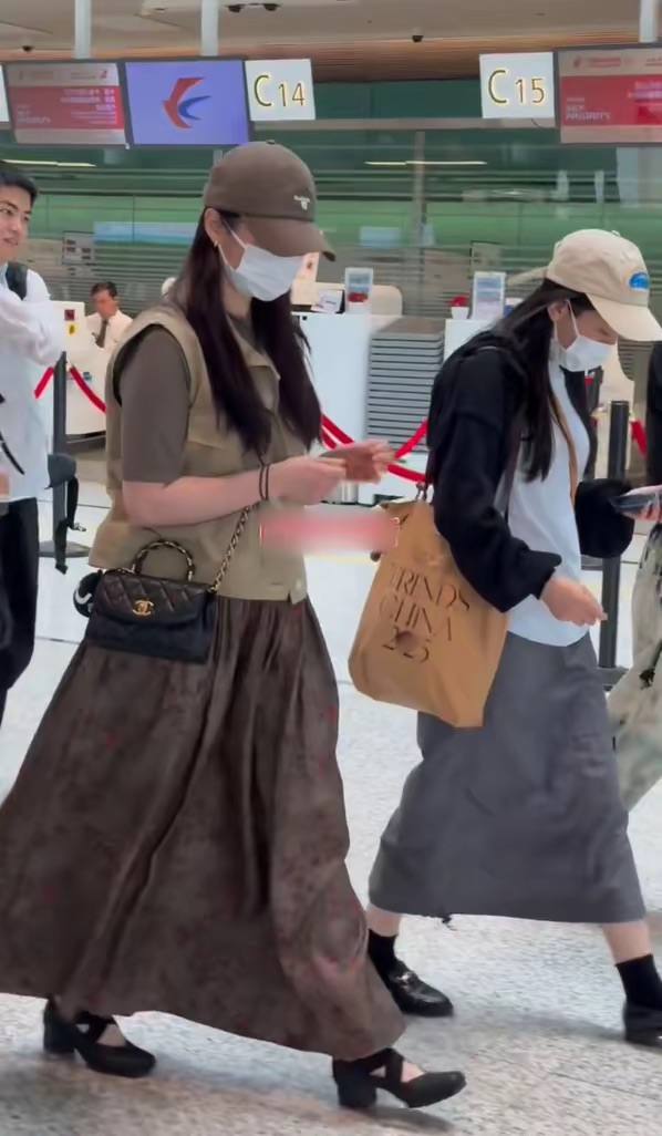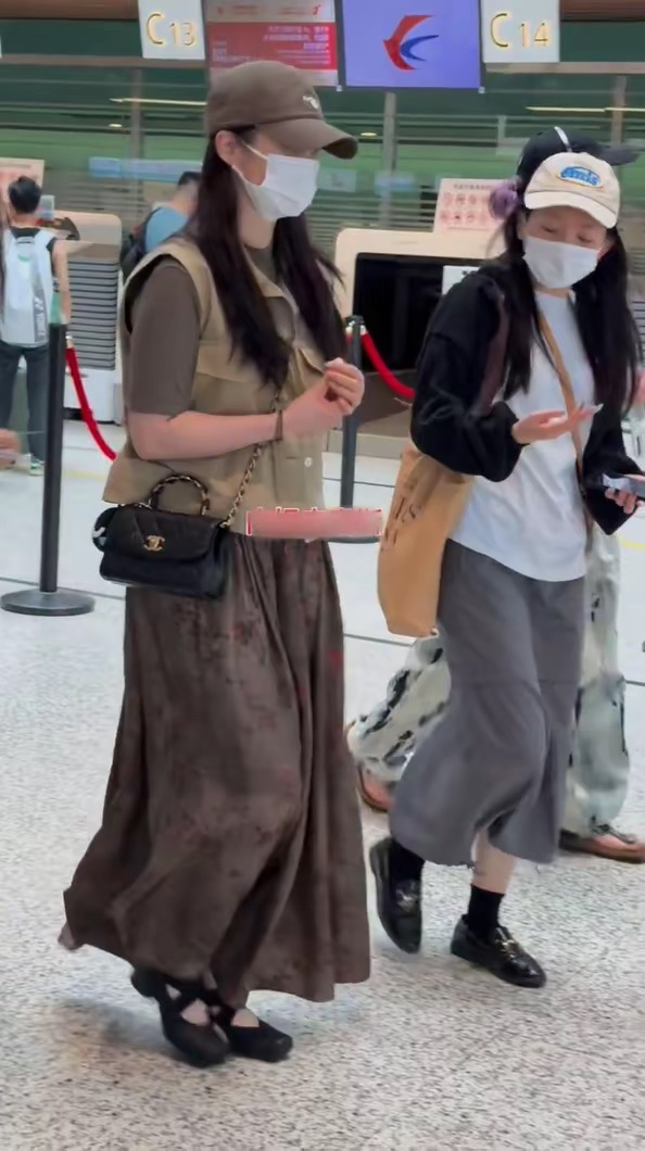 6月19日,蒋勤勤忙完工作、现身上海机场。她穿了一身卡其色的衣服,有点类似工装的马甲,棉绸质地的半身裙,优雅帅气。