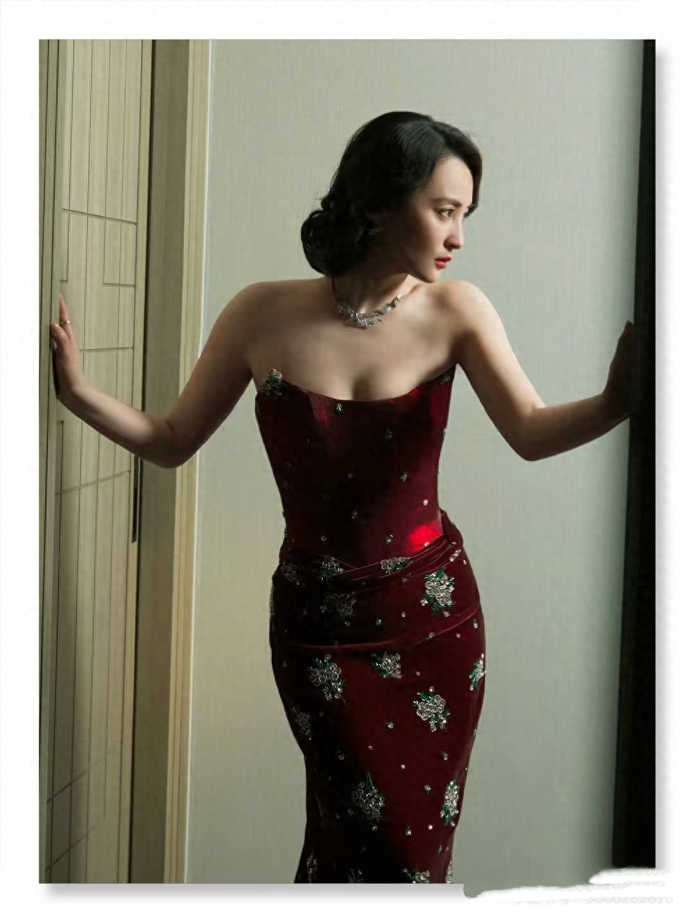一袭酒红色裹身裙,配上低矮的挽发,有一种优雅又端庄的美。风情万种、媚骨天成,用来形容她再合适不过了。
