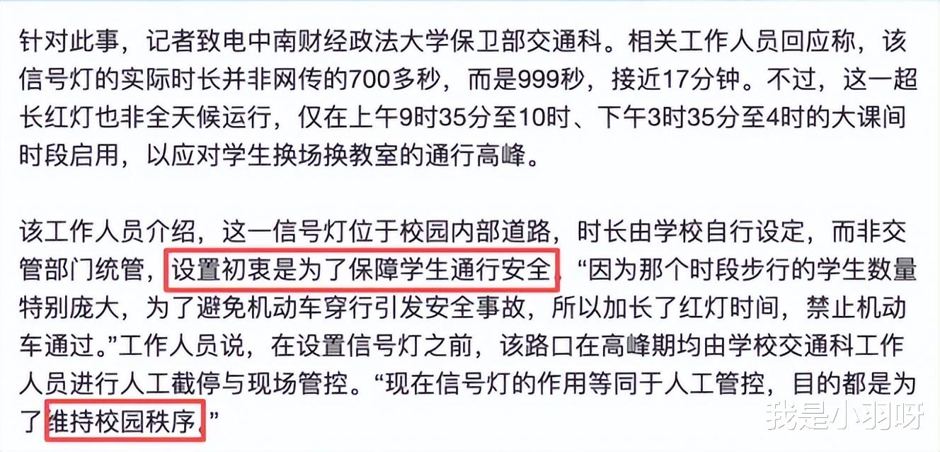 后来校方回应了,保卫处的老师说得直截了当:“那个时段步行学生特别多,为了避免机动车穿行引发安全事故,所以加长红灯时间。”