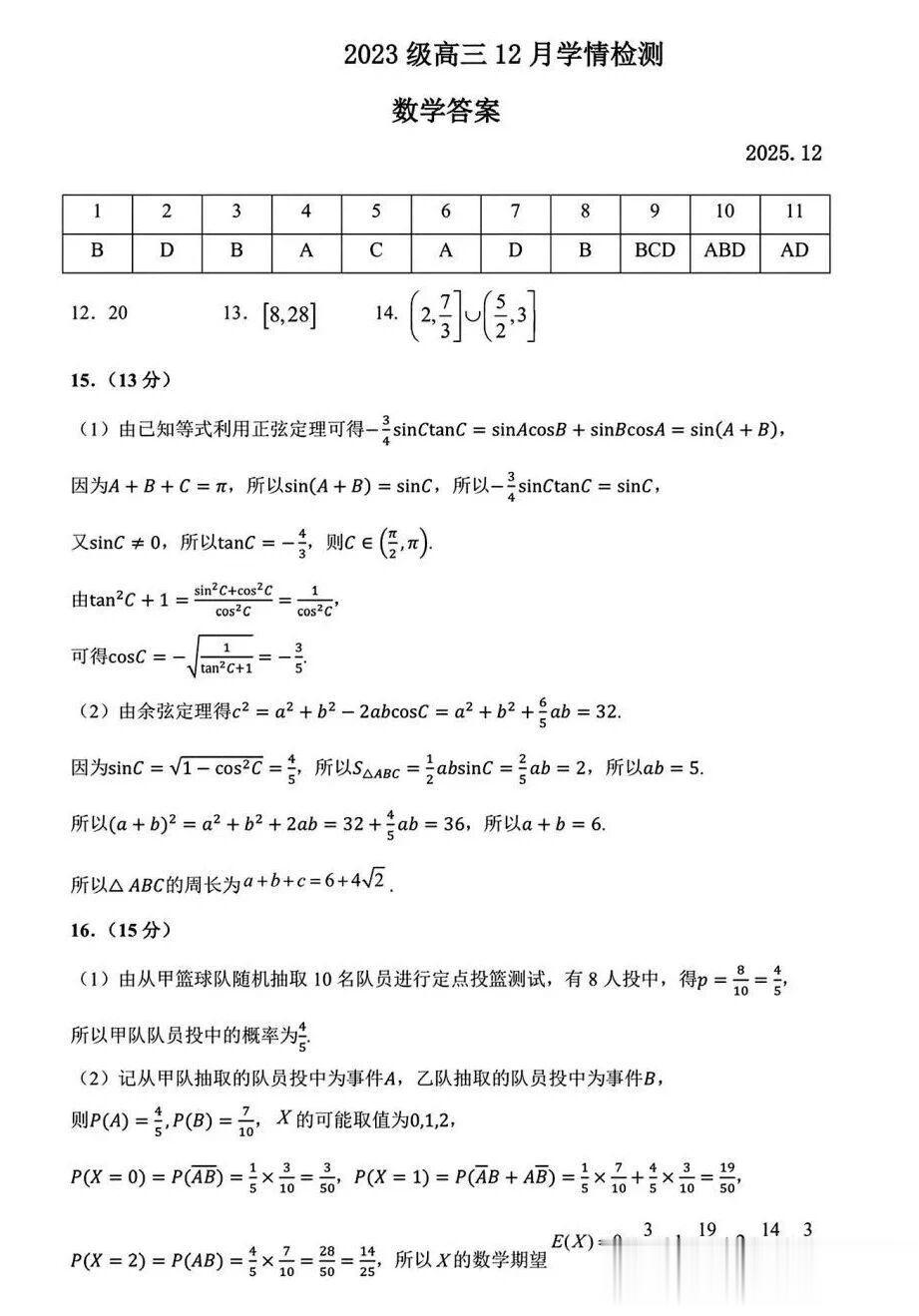 山东省济南市2026届高三12月月考数学试题答案