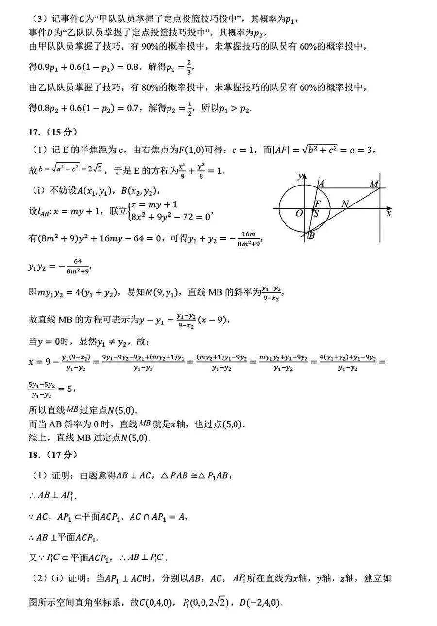 第17题:椭圆的方程求解与直线过定点问题,根据椭圆的性质和给定条件求出椭圆方程,再通过直线与椭圆的位置关系证明直线过定点,考查椭圆和直线的综合知识。
