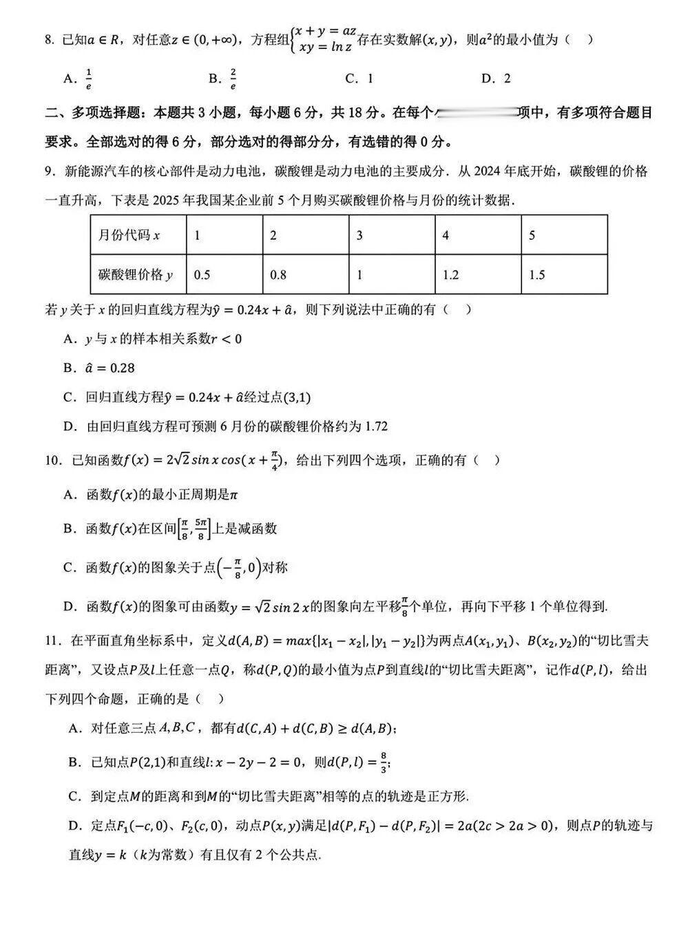 第11题:“切比雪夫距离”的概念及应用,这是试卷中的创新题型,引入新的距离定义,考查同学们对新概念的理解和应用能力,以及对命题真假的判断能力。
