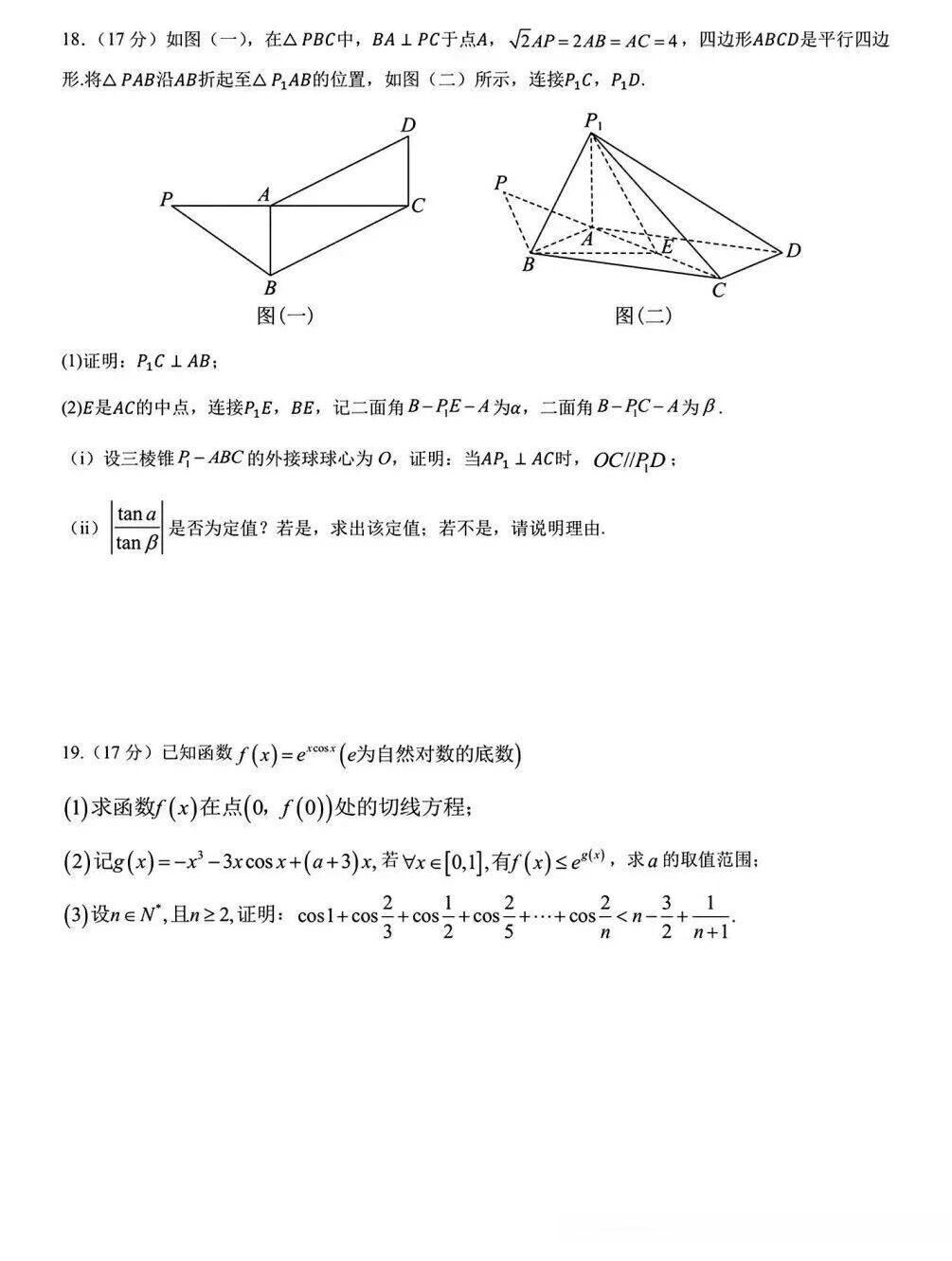 第18题:立体几何中的线面垂直证明与二面角相关问题,通过折叠问题考查线面垂直的证明,以及二面角的相关计算和定点问题,要求同学们具备较强的空间想象能力和逻辑推理能力。