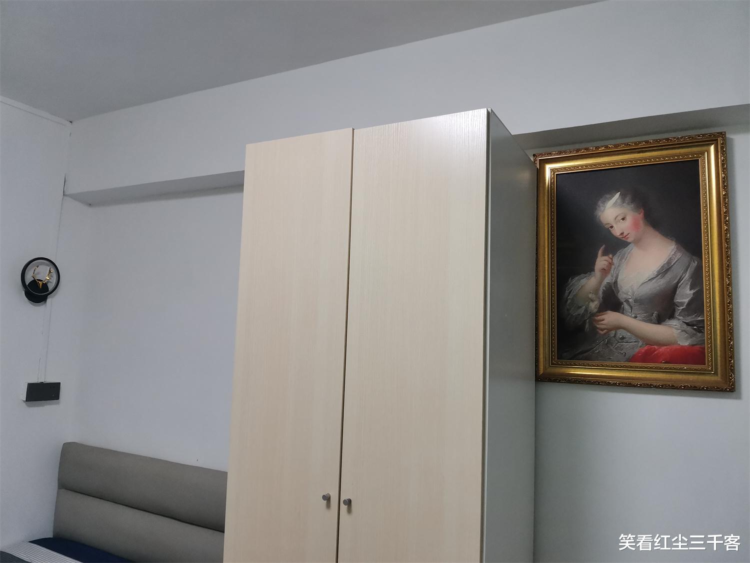 床、小沙发、茶几、衣柜、墙上还有个凑合看的装饰画,通过照片,大家也能一眼看出这些都是便宜货。