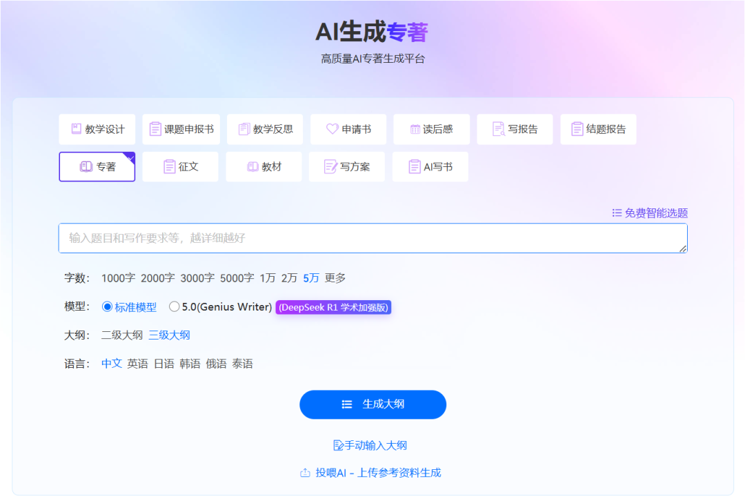 1. AI5.0技术加持,轻松处理教材和专著严写AI采用最新的AI5.0技术,特别是在处理大规模、高复杂度学术写作内容方面,具备出色的长文处理能力。无论是需要系统知识体系的教材,还是要求深度论证的学术专著,这款AI写论文软件都能确保数十万字内容的前后逻辑连贯、术语统一,有效避免章节间的观点断层或重复,对于AI写教材、AI写专著的高标准都能高效应对,极大保障了大型学术写作项目的整体性。